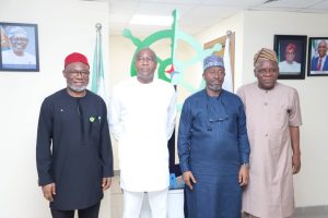 R-L: Executive Director Operations, Nigerian Maritime Administration and Safety Agency, NIMASA, Engr. Fatai Adeyemi; Chairman, House of Representatives Committee on Safety Standards and Regulations Hon. Abubakar Sulaiman; Executive Director, Finance and Administration, NIMASA, Chudi Offodile; and a member of the committee during an oversight visit by the committee to the agency’s headquarters in Lagos.