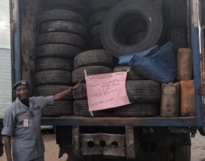 On May 19, a patrol team intercepted a Volvo truck at 3:00 am loaded with 1,263 used tyres and other contraband. Later the same day at 11:00 pm, another truck was seized along the Shagamu/Ijebu-Ode expressway in Ogun State for carrying bulletproof vests and packages of Tramadol.