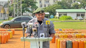 According to the CGC, a total of 102 enforcement interventions were recorded, leading to the interception of a wide range of the prohibited and smuggled goods which include: 3,500 bags of foreign parboiled rice (50kg each) – equivalent to 6 trailer load, 304kg of Cannabis Sativa (Indian Hemp), 7,900 liters of Premium Motor Spirit (PMS) – in 316 jerry cans of 25 liters each, 54 bags and 20 bales of used clothing, 41 sacks and bags of used footwear, 14 units of used (“Tokunbo”) vehicles, 148 pieces of used tyres, 42 used gas cylinders, 31 units of air conditioning systems and 95 cartons of frozen poultry products.